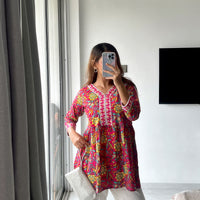 Bold Floral Digital Print Kurti with White Lycra Plazzo – Vibrant & Stylish SetStep into vibrant fashion with this bold floral printed kurti in shades of purple, red, and green. Crafted from soft rayon fabric, it's paired with a comfy white stretchable plazzo, perfect for casual outings, office wear, or festive brunches. Its eye-catching design is sure...