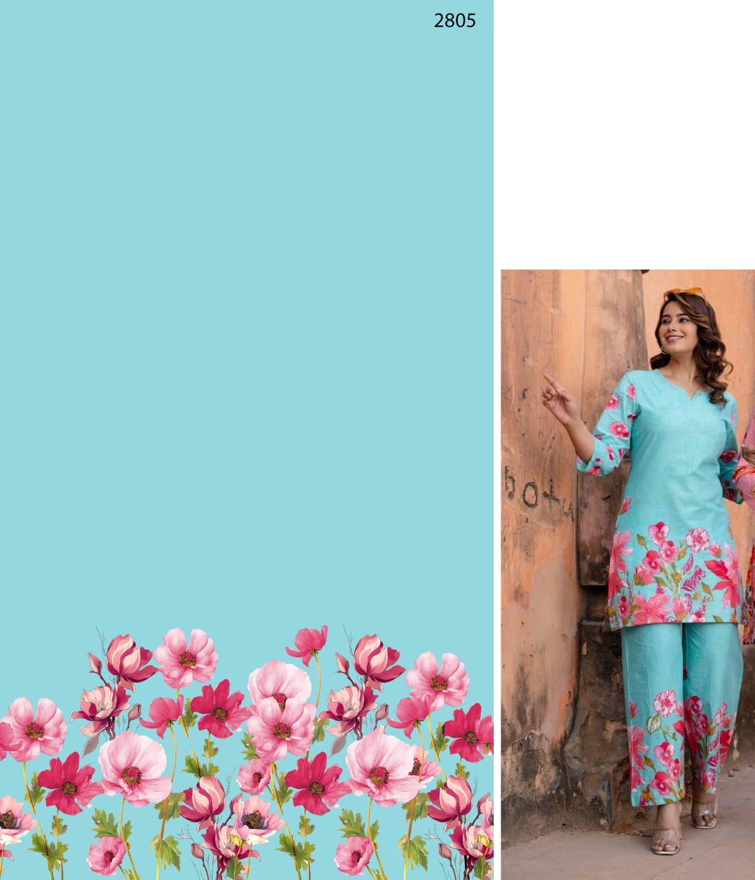Fresh, cheerful, and undeniably pretty — this aqua co-ord set bursts to life with vibrant florals in hues of rose pink and blush. The soft V-neck kurta with 3/4th sleeves is adorned with blooming prints at the hem and sleeves, while the matching straight pants echo the same botanical joy. Ideal for day events or a casual lunch, this outfit blends comfort with a garden-fresh vibe.