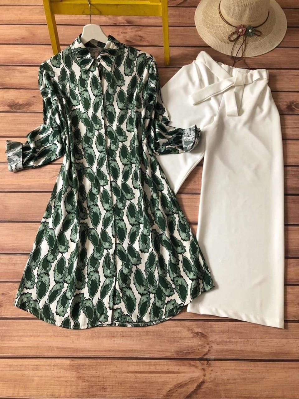 Embrace a fresh, nature-inspired look with this stylish green leaf print kurti plazzo set. The kurti is crafted from soft reyon fabric, showcasing an elegant green digital leaf print that adds a touch of sophistication. Paired with a classic white stretchable lycra plazzo, this outfit ensures both style and comfort, perfect for daily wear or small gatherings.