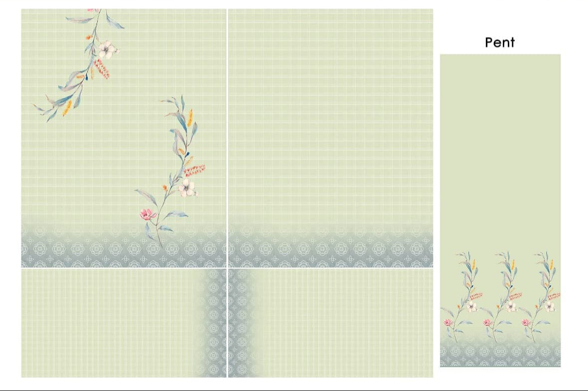 Color Palette: Light mint base with earthy red, green, mustard, grey, and blush tones