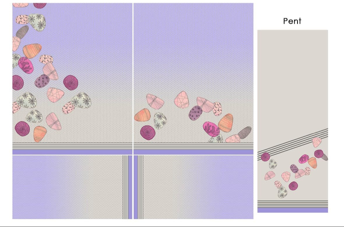 Step into playful sophistication with this lilac and grey co-ord set adorned with abstract botanical motifs. The top features a gentle gradient from cool lilac to soft grey, with scattered leaf and pod-like elements in vibrant hues of magenta, orange, and sage. The pants echo the print at the hem, framed with chic monochrome stripes, creating a modern yet nature-inspired aesthetic.