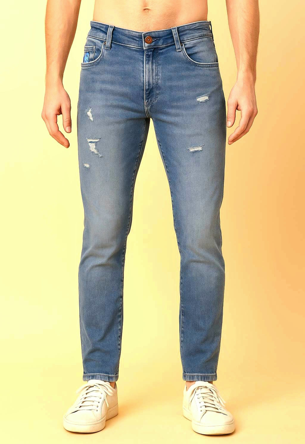 Step up your style with these light blue slim-fit jeans, crafted from premium cotton and designed with trendy scratch and distressed detailing. The perfect mix of rugged and refined, these jeans offer all-day comfort and street-ready appeal. Ideal for casual outings or day-to-day wear.