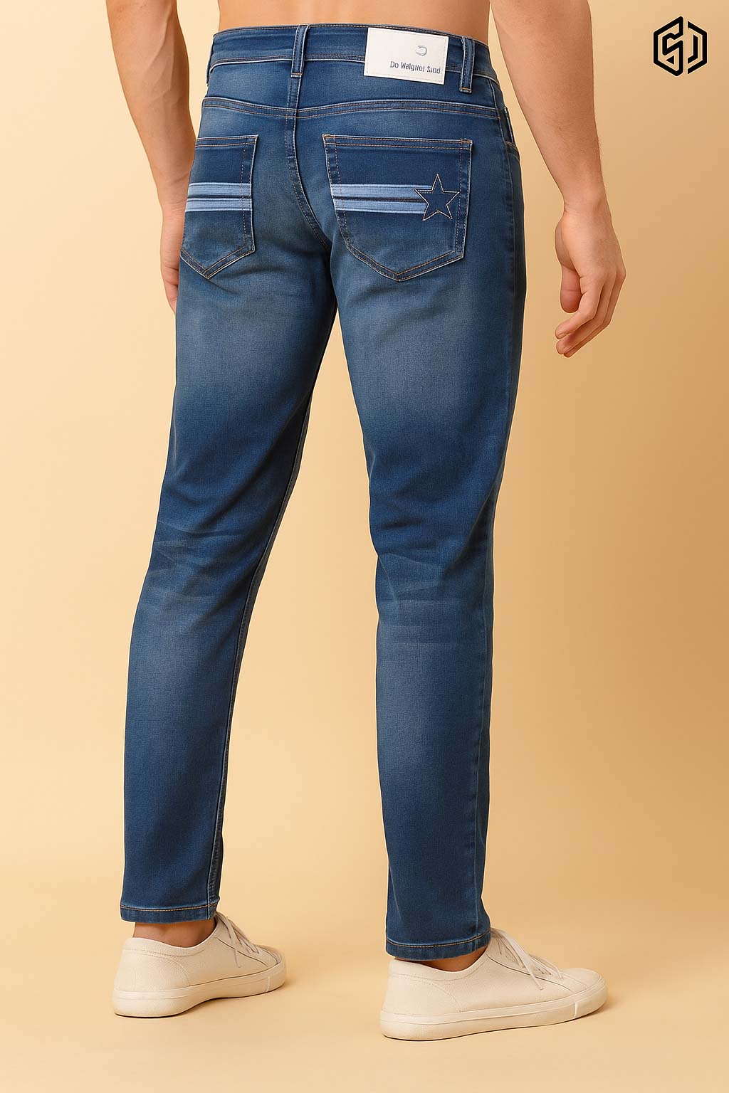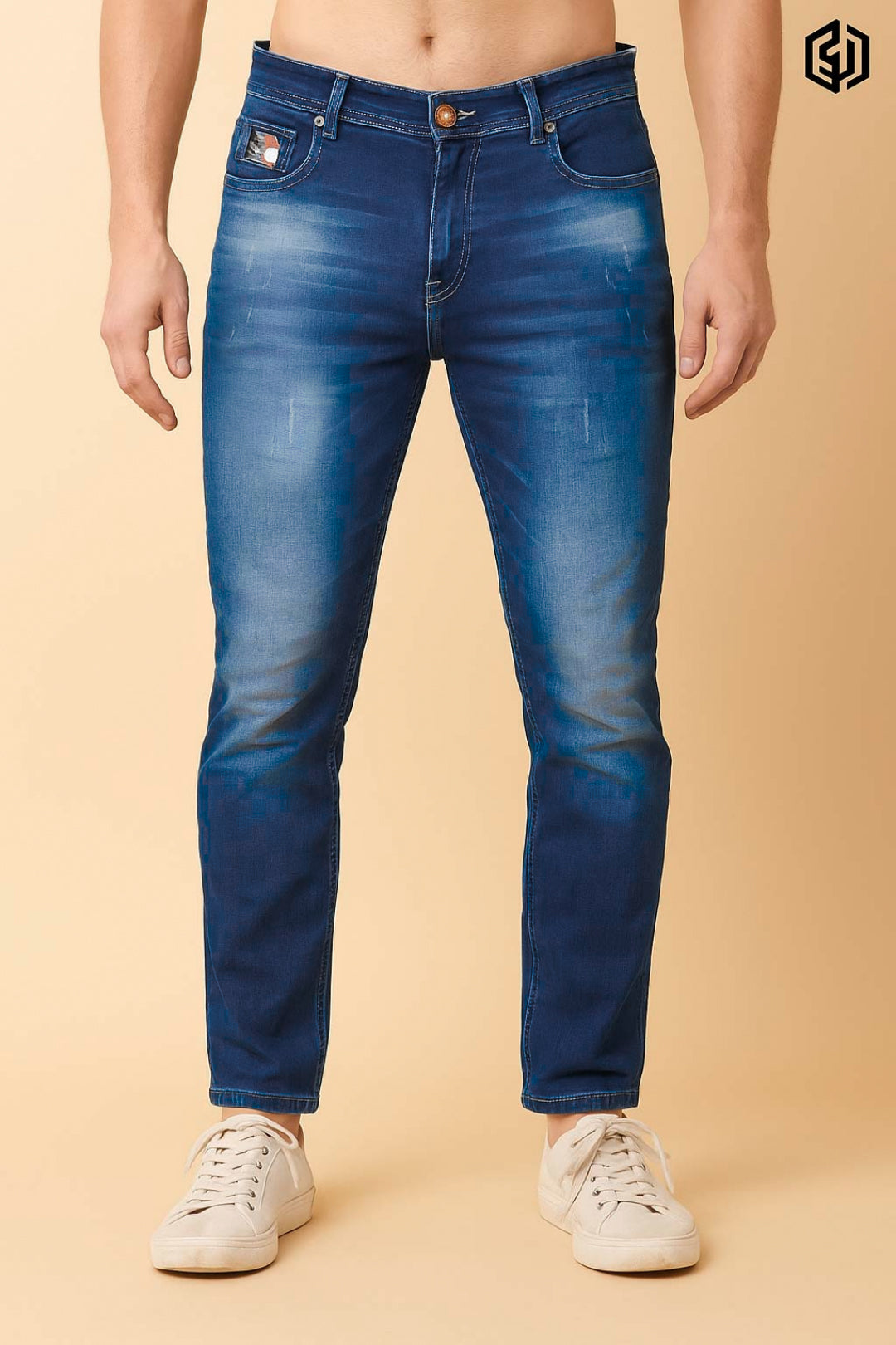 Upgrade your casual wardrobe with these stylish slim-fit jeans. Crafted from high-quality denim, these jeans feature a trendy distressed wash effect with subtle fading and whiskering for a rugged, modern look. The comfortable fit and soft fabric make them perfect for all-day wear, whether you're out with friends or on the go. The unique patch design on the coin pocket adds a bold and distinctive touch.