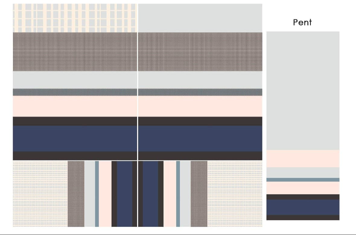 Top: Button-down shirt with a mix of checkered, solid, and striped panels in shades of grey, navy, blush pink, and black