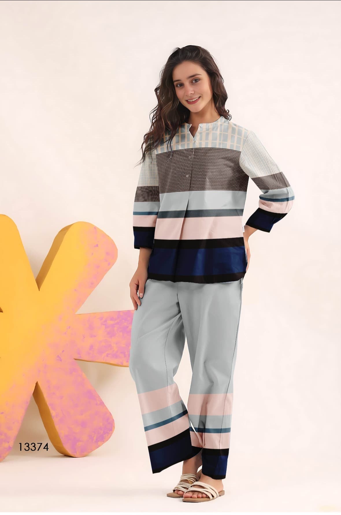 This co-ord set brings a contemporary twist to timeless stripes. With its soft grey base and layered horizontal bands in navy, blush pink, black, and houndstooth textures, the shirt offers a striking, structured look. Paired with wide-leg trousers echoing the same color-block detail at the hem, it’s a fashion-forward piece that balances polish and comfort with ease.