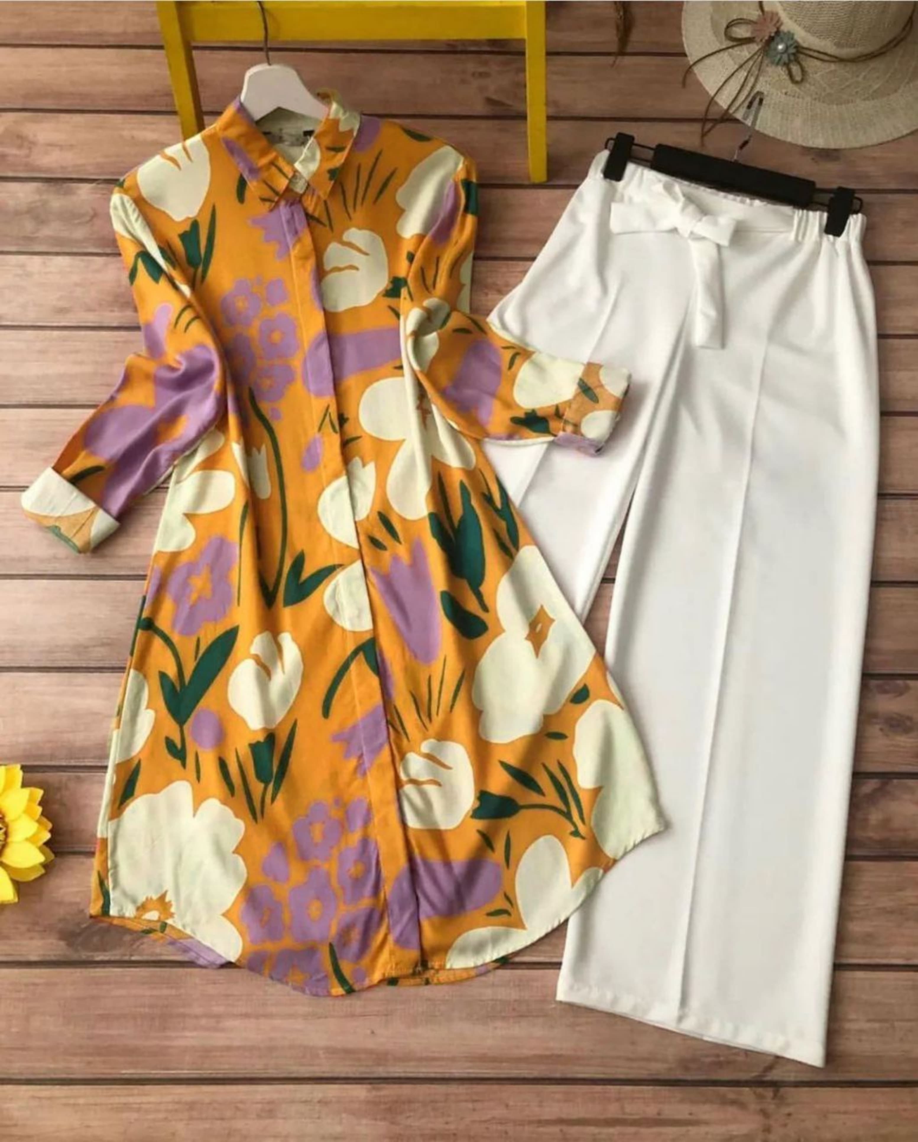 Add a vibrant twist to your everyday style with this mustard yellow kurti adorned in eye-catching floral digital prints. The set comes with a trendy white plazzo featuring a bow-tie waist, perfect for giving you an elegant yet effortless look for casual outings, festive wear, or office use.
