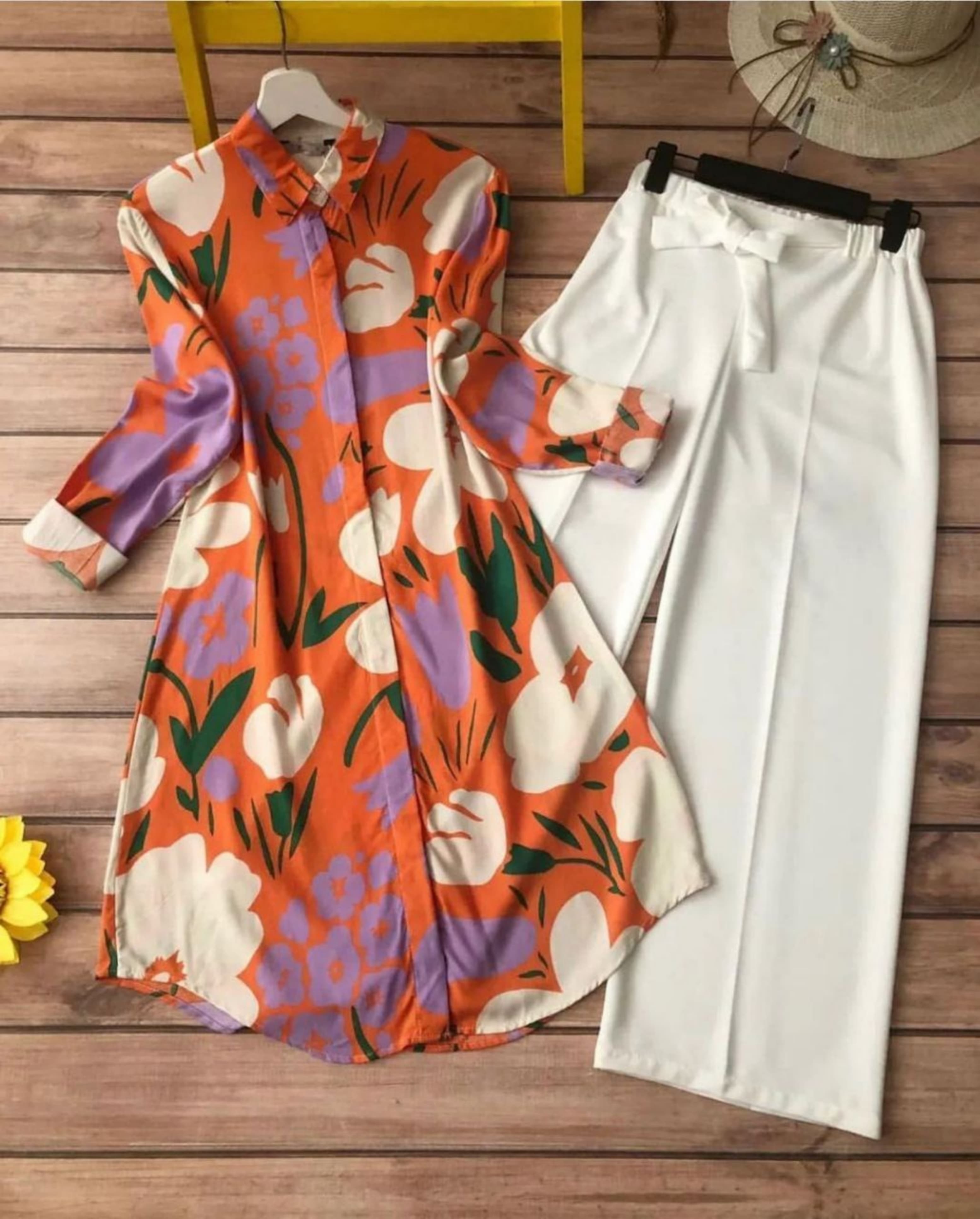 Turn heads with this vibrant orange floral kurti, beautifully accented with shades of cream, purple, and green. Made from breathable rayon and paired with a soft, stretchable white plazzo featuring a stylish waist bow, this outfit offers both fashion and comfort—perfect for festive wear, office style, or casual outings.