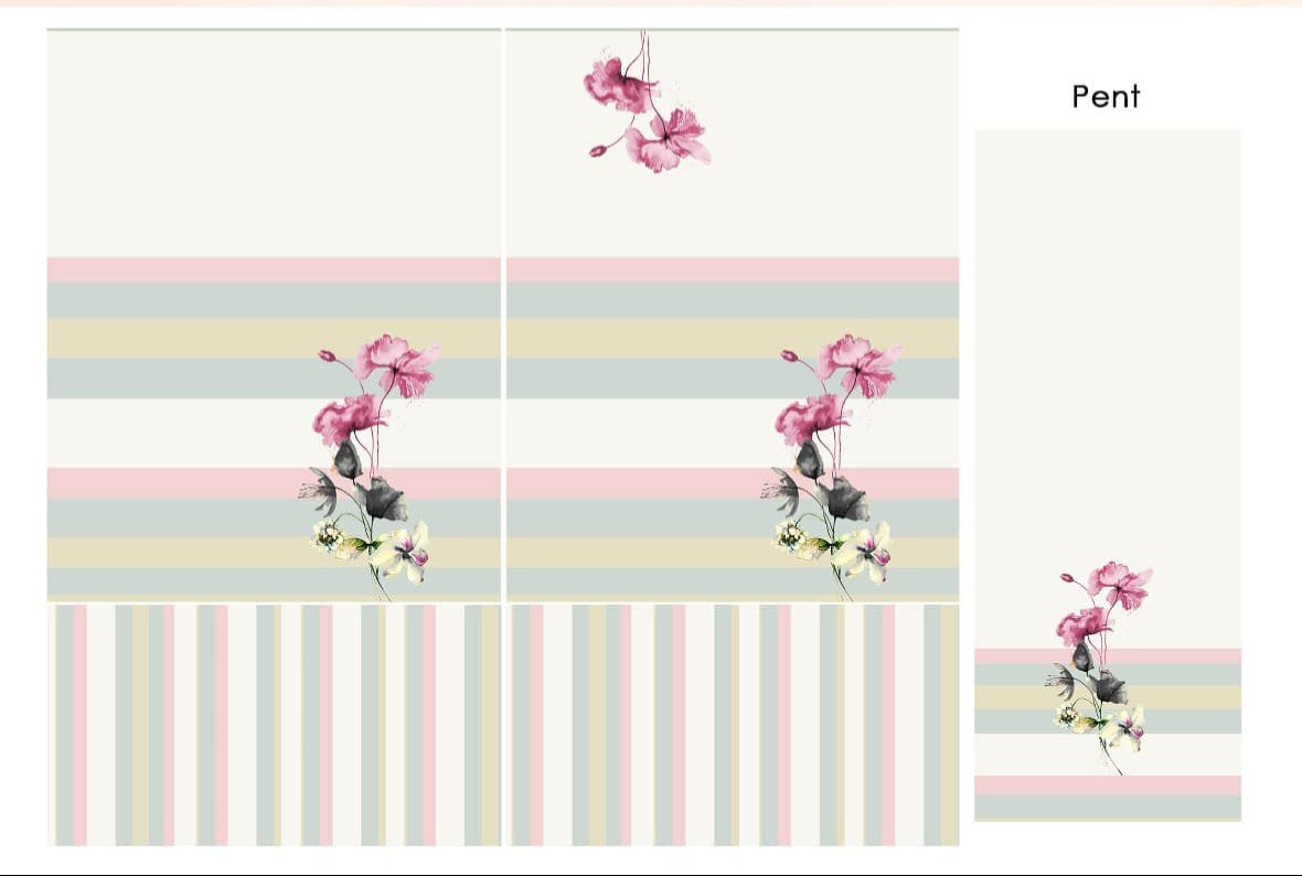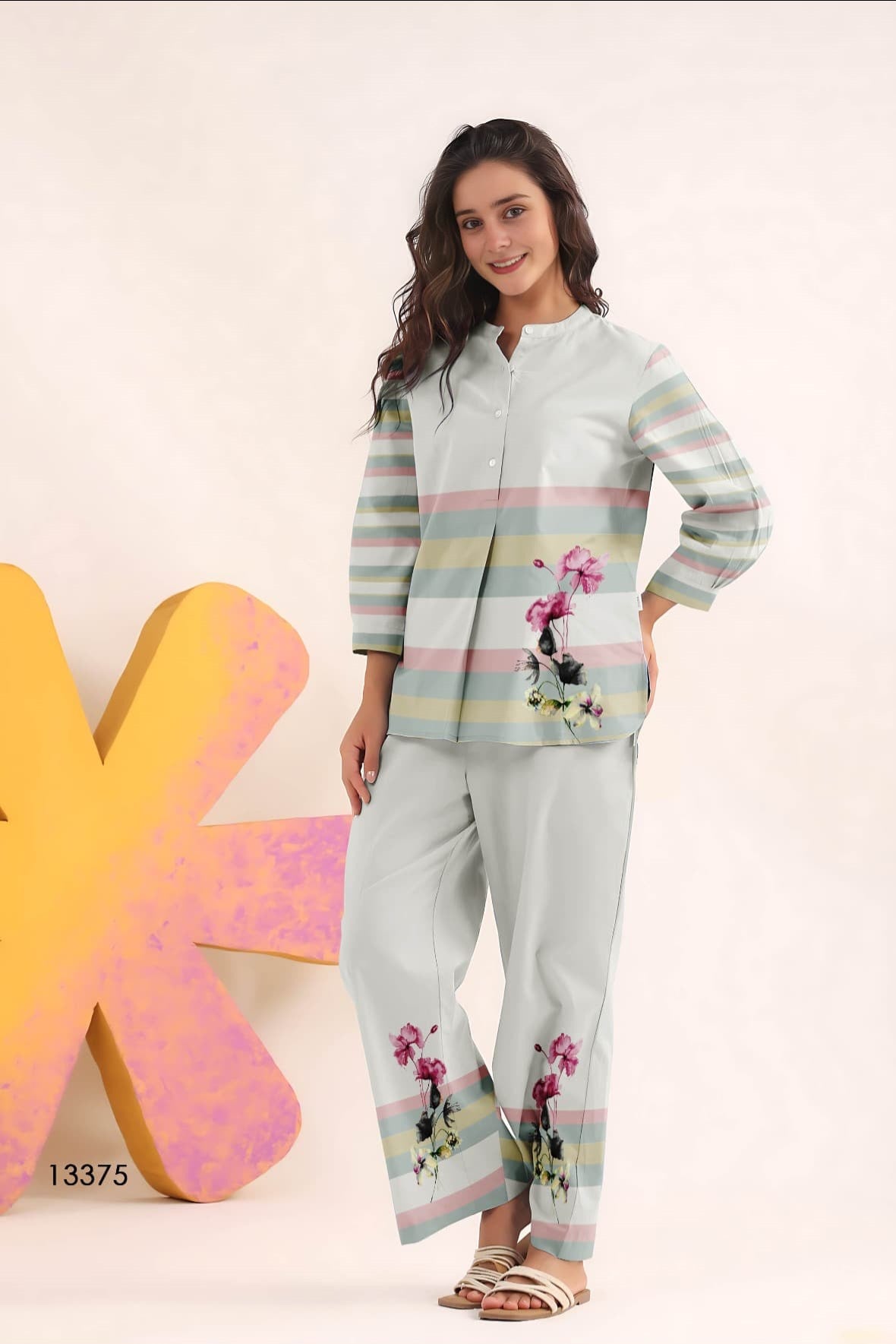 A serene expression of soft pastels and floral elegance, this co-ord set is crafted for effortless daytime charm. The shirt features horizontal bands in gentle hues of sage green, blush pink, and butter yellow—accented with a delicate floral motif near the hem. The trousers mirror this design with floral clusters blooming over coordinating stripes at the hem. Feminine and fresh, this look is perfect for brunch dates or garden gatherings.