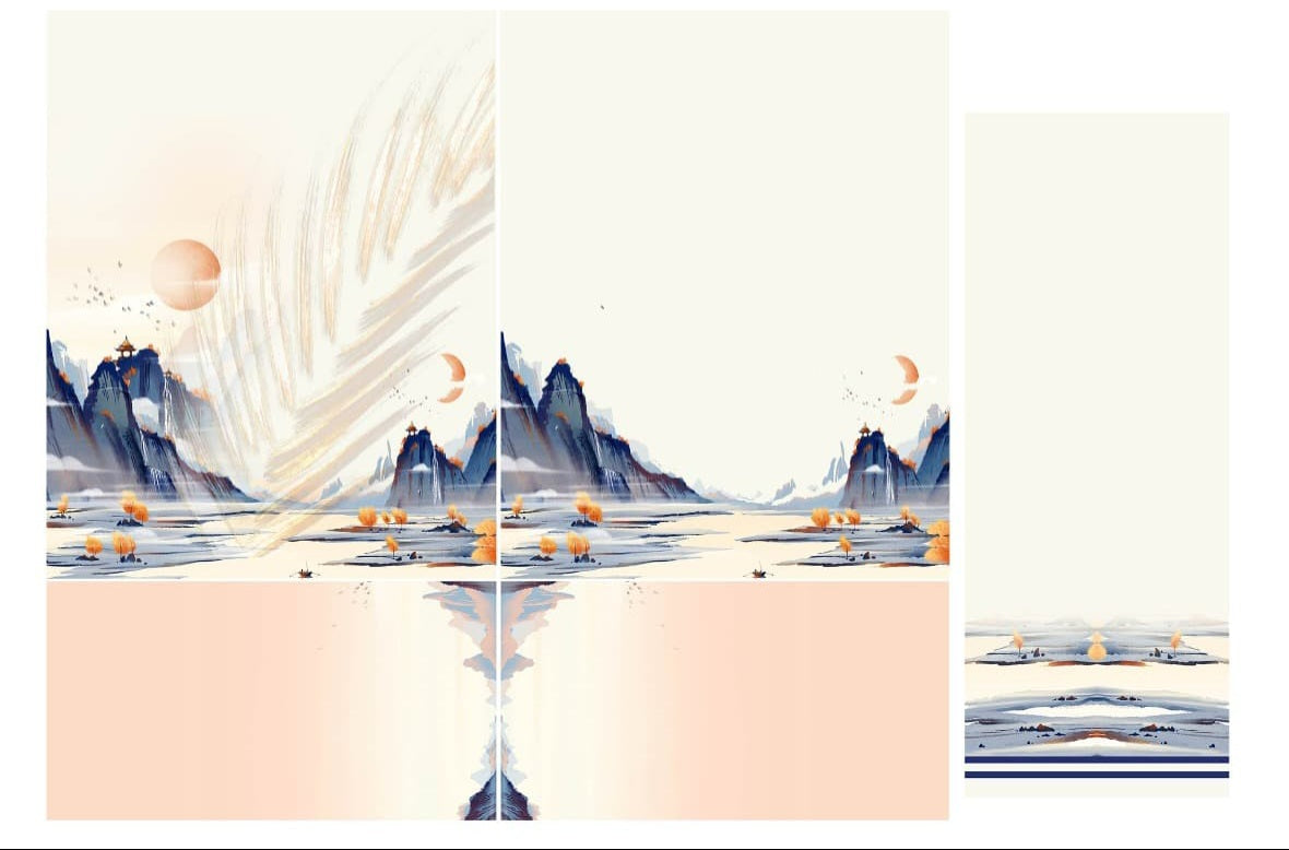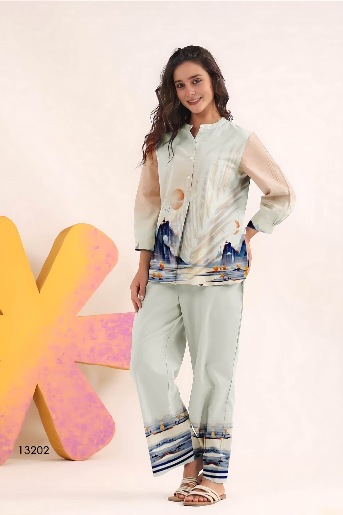 Immerse yourself in a calming dreamscape with this moonlit co-ord set. The shirt features a serene abstract landscape with misty mountains, distant boats, and celestial moons that give a magical twilight vibe. Soft pastel tones paired with painterly brushstrokes evoke peace and elegance. The trousers subtly mirror the horizon art at the hem, tying the look together with a refined touch.