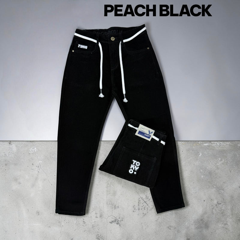 Premium stretch denim fabric l Stylish Tokyo print on back pocket l Mon fit design for a modern look l Comfortable for all-day wear l Durable stitching and high-quality finish l Trendy peach black color