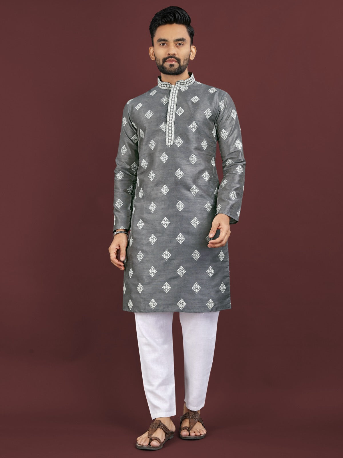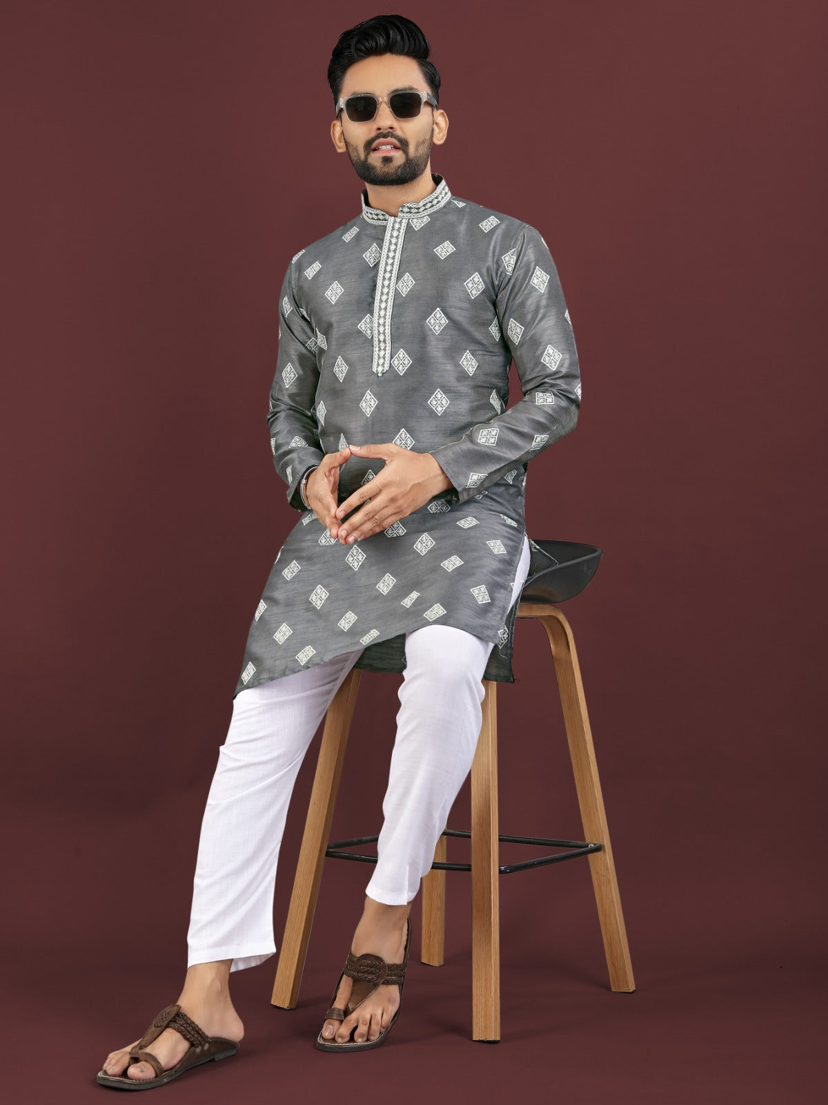 Elevate your desi boy style with this timeless multicolor kurta, crafted in dark mono silk fabric with elegant sequin embroidery. Featuring a classic placket, straight hemline, and full sleeves, this kurta is perfect for festive, party, or casual occasions. Paired with comfortable white cotton pyjama pants, it ensures both style and ease.