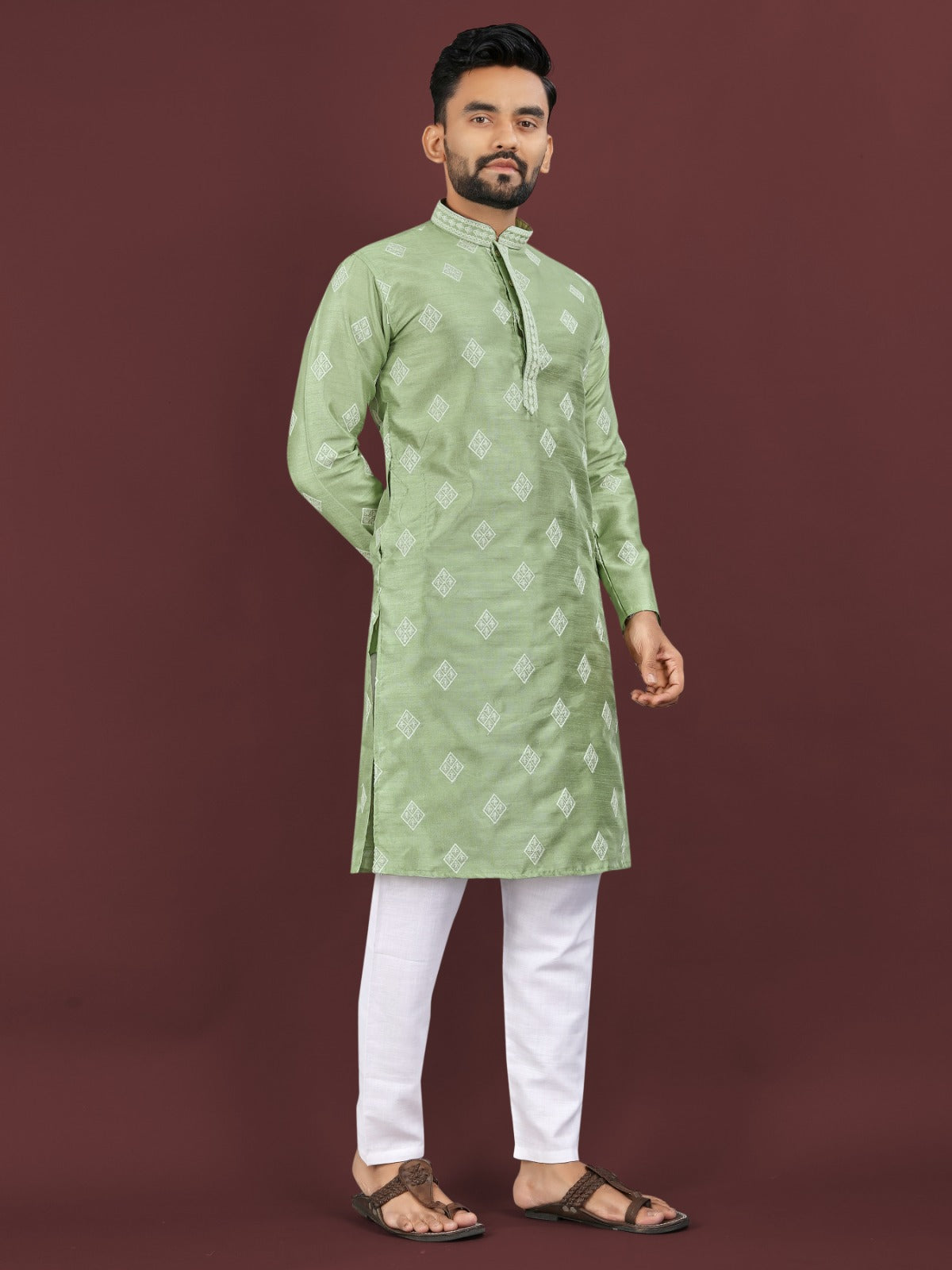 Step into elegance with this refreshing green mono silk kurta, crafted with stylish sequin embroidery motifs that add a subtle shine. Designed with a classic placket, straight hemline, and full sleeves, this kurta pairs beautifully with a crisp white cotton pyjama for a sophisticated traditional look. Ideal for festive events, casual gatherings, or parties, this outfit is a must-have for your ethnic wardrobe.